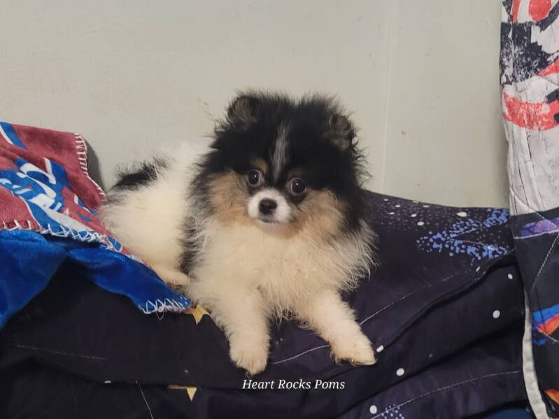 Mackenzie is a tri black parti, she's a non-color carrier and will be paired with a merle. Her pedigree boasts impressive show lines.